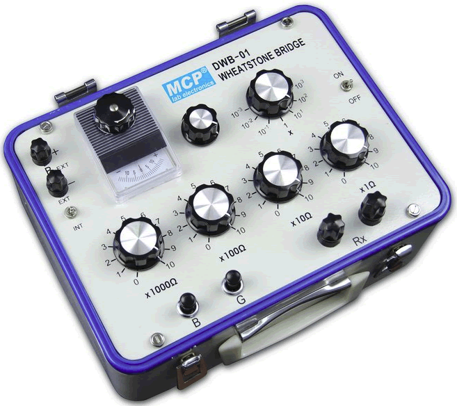 - Με ενσωματωμένο γαλβανόμετρο, ενσωματωμένη πηγή ΗΕΔ, τέσσερις βραχίονες (αντιστάσεις) 1000Ω×10 + 100Ω×10 + 10Ω×10 + 1Ω×10 και έναν πολλαπλασιαστή.