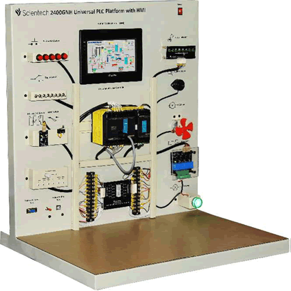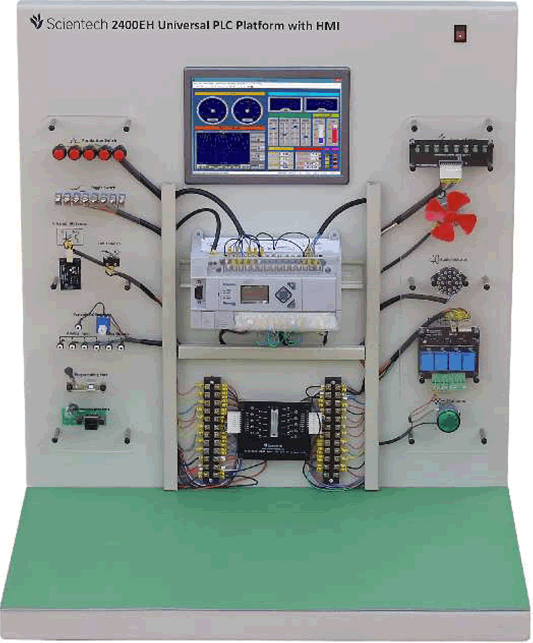 Εκπαιδευτικό-πειραματικό επιτραπέζιο σύστημα, σχεδιασμένο για την μελέτη των PLC και των διεπαφών HMI, σε βιομηχανικές εφαρμογές. Κατάλληλο για την εξοικείωση με την καλωδίωση των PLC, τη χρήση διακοπτών και αισθητήρων, και την επικοινωνία με διεπαφή HMI, για έλεγχο και διαχείριση του συστήματος.