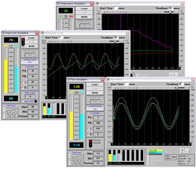 Λογισμικό προσομοίωσης ελέγχου διεργασιών στάθμης, ροής, θερμοκρασίας, όγκου, με ελεγκτές Ρ, ΡΙ, PID, με μενού εύκολο στη χρήση, κατάλληλο για εκπαιδευτικούς σκοπούς.