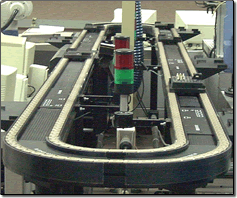 - Ο ταινιόδρομος σταματά σε κάθε σταθμό εργασίας, που φέρει μαγνητικούς αισθητήρες ανίχνευσης των παλετών ενώ πνευματικά έμβολα επιτρέπουν την απελευθέρωση – συγκράτηση των παλετών.