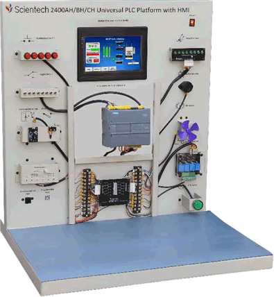 Εκπαιδευτικό-πειραματικό επιτραπέζιο σύστημα, σχεδιασμένο για την μελέτη των PLC και των διεπαφών HMI, σε βιομηχανικές εφαρμογές. Κατάλληλο για την εξοικείωση με την καλωδίωση των PLC, τη χρήση διακοπτών και αισθητήρων, και την επικοινωνία με διεπαφή HMI, για έλεγχο και διαχείριση του συστήματος.
